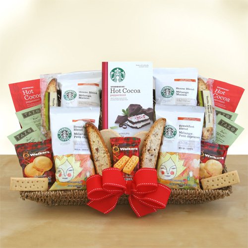 Starbucks Holiday Greeting, Our Starbucks Galaxy collection has everything needed to spice up a chilly winter's day! Spread the warmth of the season as you gather friends, family and colleagues to enjoy the Starbucks Breakfast blend and House blend coffees, peppermint hot cocoa mix, Tazo Zen tea, Nonni's biscotti, Walker's shortbread rounds, and Walker's shortbread fingers. All assembled in a natural woven basket and tied with a festive red bow.